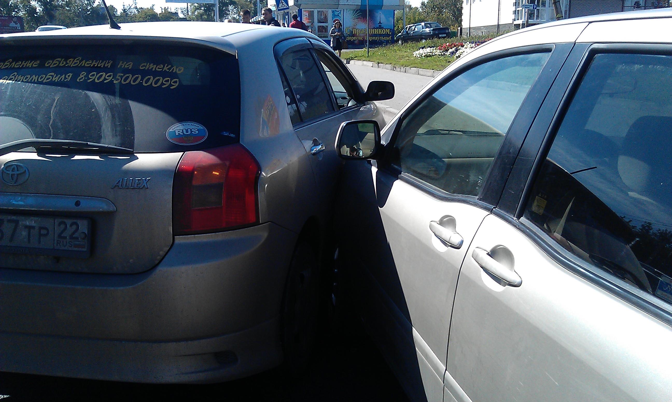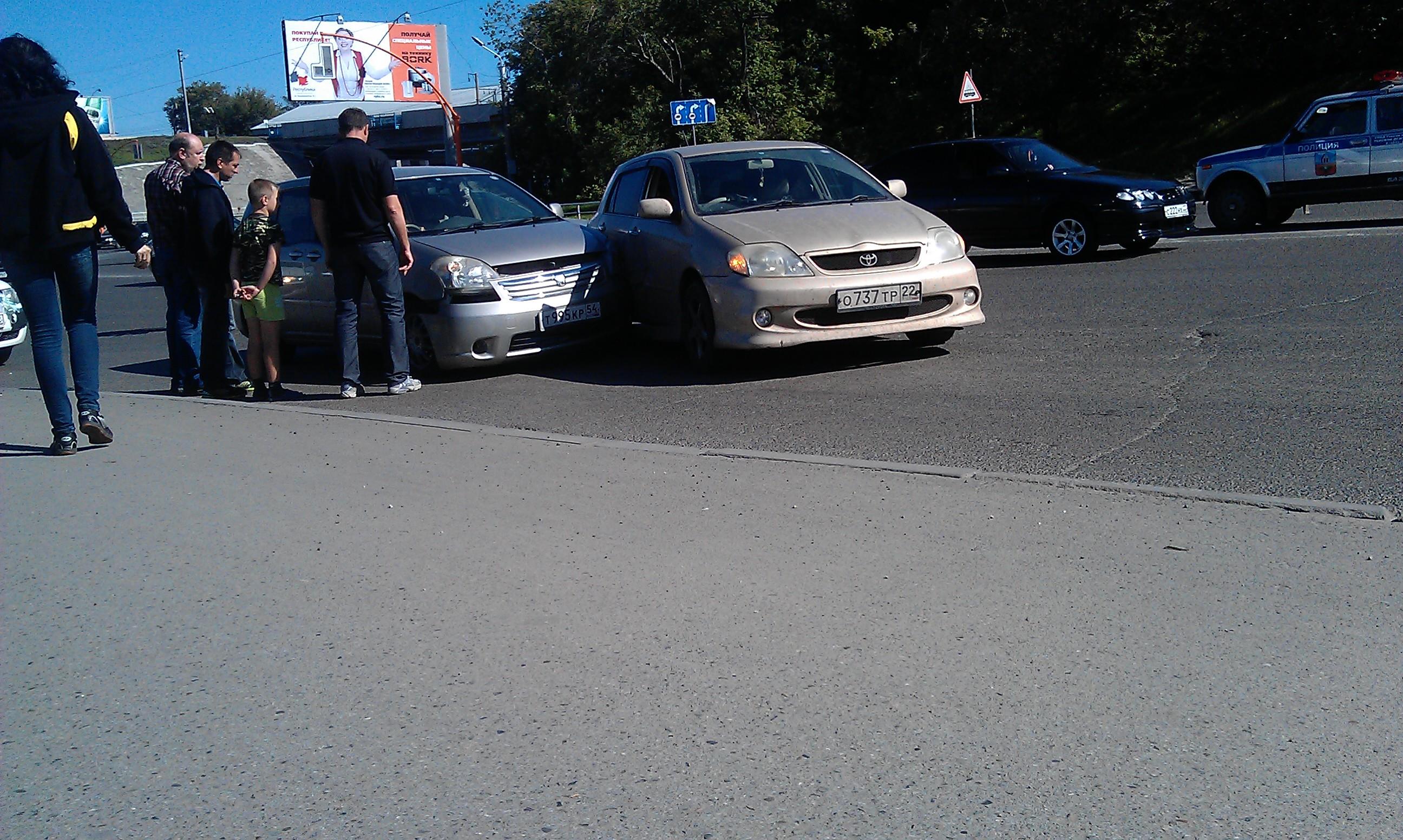 ДТП между Тойота Алекс (золотистого цвета) и Тойота Раум (серебристого цвета). Алекс двигался по Павловскому тракту правым крайним рядом со стороны проспекта Строителей, Раум выезжал с Советской Армии, не уступив дорогу, совершил столкновение с Тойота Алекс. При ударе Раум "протолкал" Тойоту Алекс несколько метров так, что Алекса повернуло на несколько градусов. Водитель Тойота Раум утверждает, что Алекс его подрезал. Ситуация спорная.