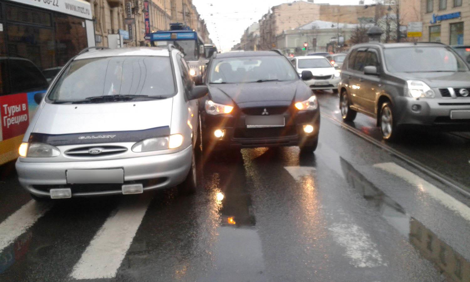 ДТП произошло 12 апреля 2014 г. (в субботу) на пересечении Литейного пр. и Фурштатской ул. (движение в сторону Литейного моста). Первый участник - автомобиль Mitsubishi ASX, второй - Ford Galaxy.