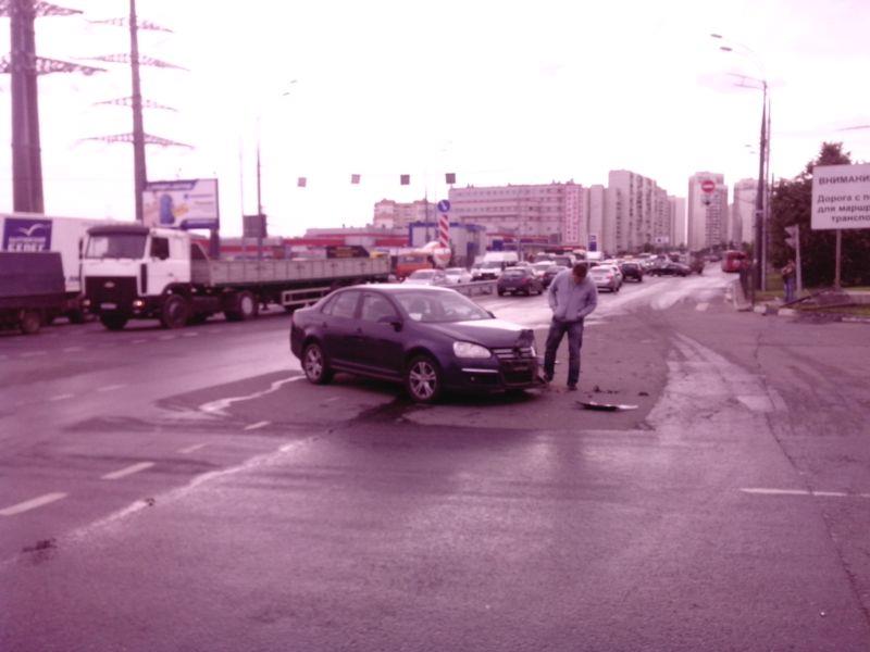 Фольксваген (в область), поворот по левой стрелке, на 1-ый Митинский пер., Мерседес (из области) прямо, на красный.
