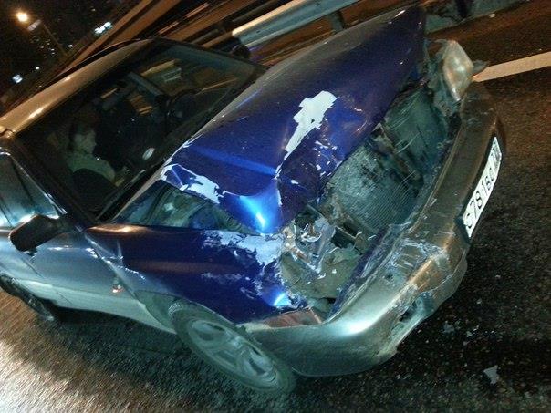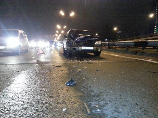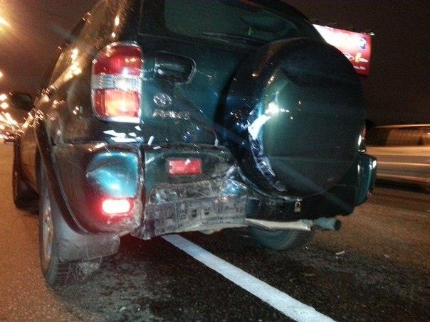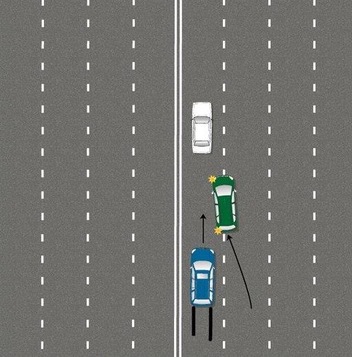 Синий Subaru Forester при экстренном торможении въехал сзади в тёмно-зелёный Toyota RAV4 в момент перестроения и торможения.