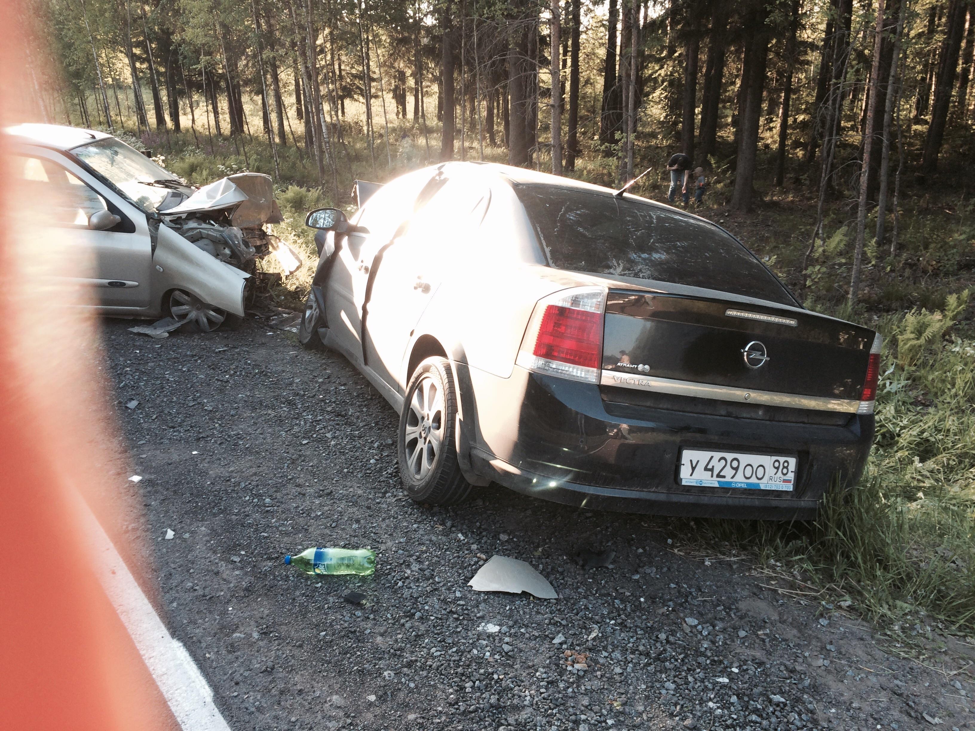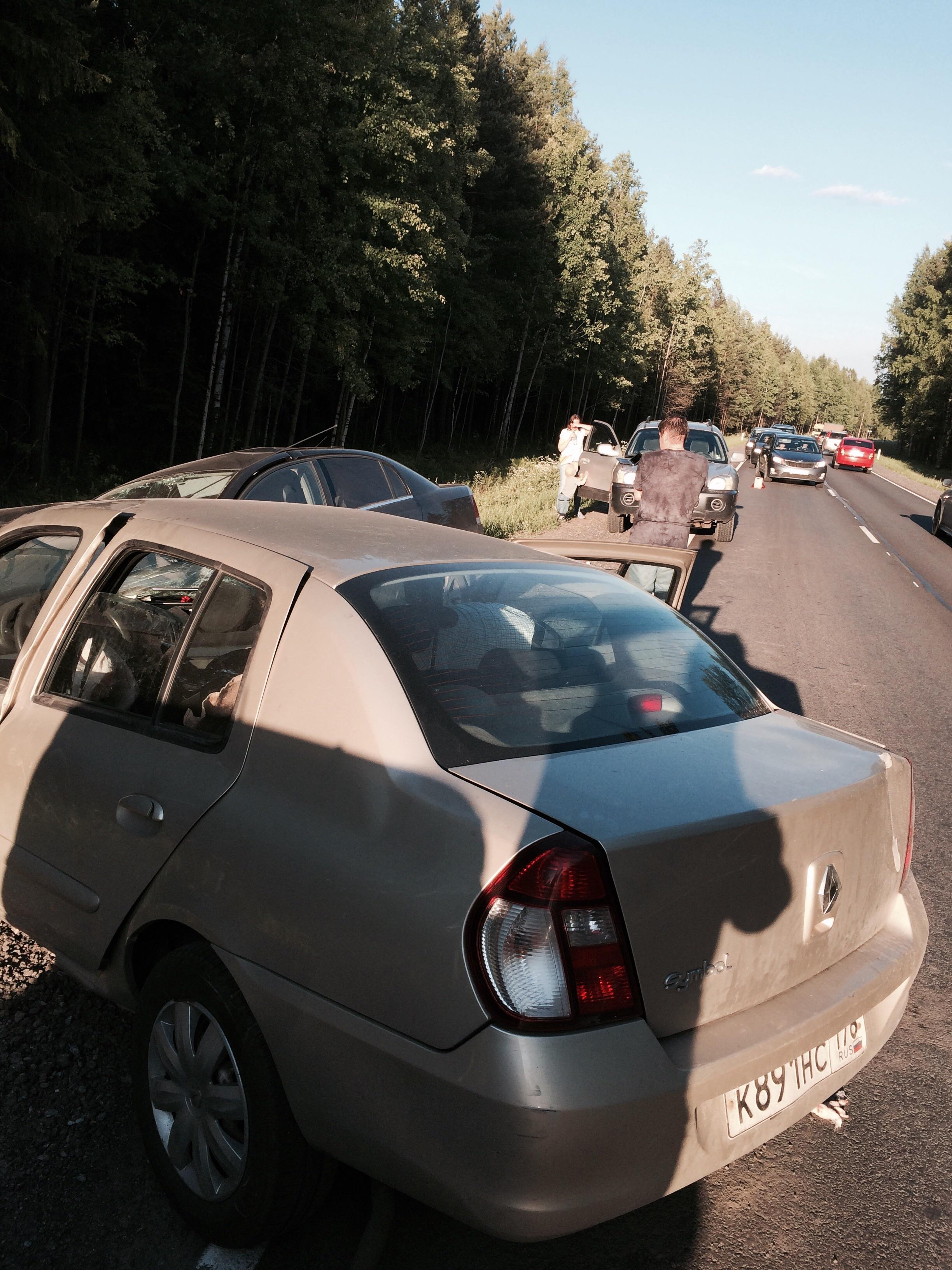 Водитель красного автомобиля (предположительно Citroen C4), выехав на встречную полосу спровоцировал лобовое столкновение Renault Symbol и Opel Vectra и скрылся