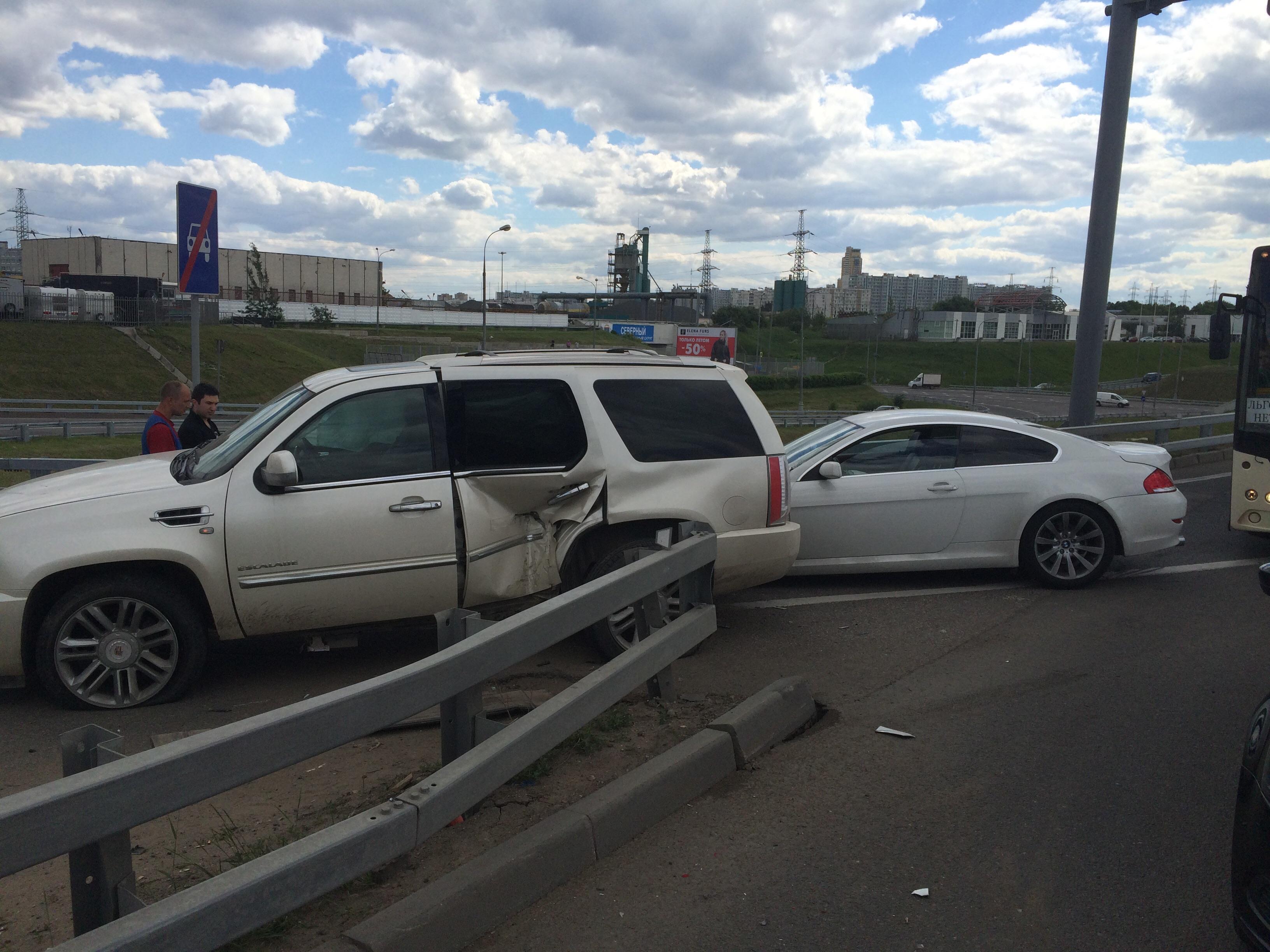 Событие произошло на внутренней стороне МКАД при повороте к ТЦ "ДЕКСТЕР". Столкнулись два автомобиля, Кадиллак Эскаладе белого цвета и БМВ 630 белого цвета. Кто был свидетелем или заснял на видеорегистратор,прошу откликнуться.