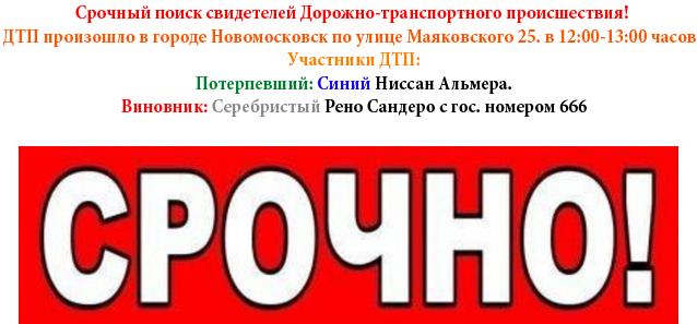 ДТП произошло в городе Новомосковск по улице Маяковского 25. в 12:00-13:00 часов. Участники ДТП: Потерпевший: Синий Ниссан Альмера. Виновник: Серебристый Рено Сандеро с гос. номером 666