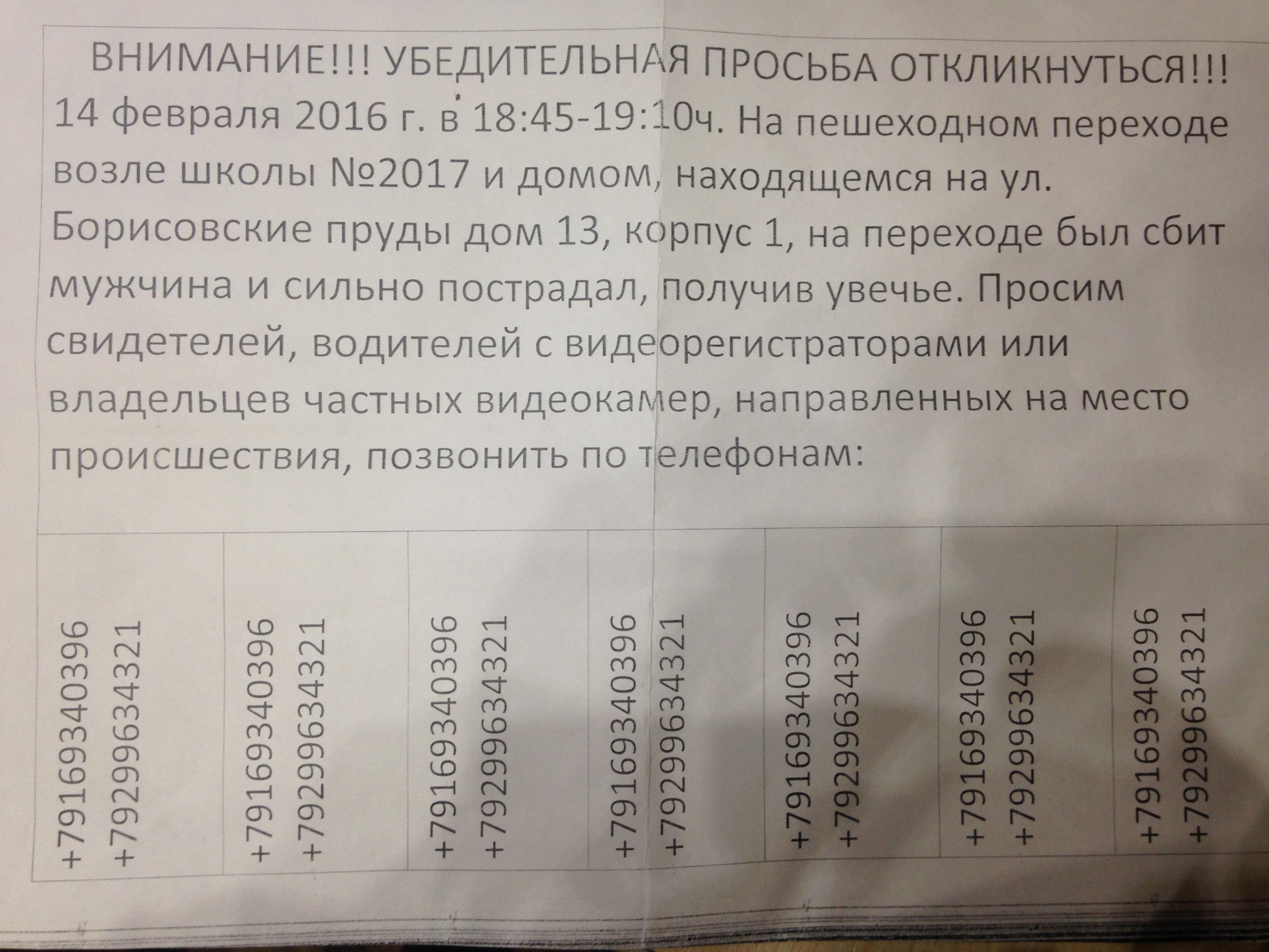 Очевидцы дтп г. Москва на ул. Борисовские пруды в 14.02 2016г в 18.45 ч на пешеходном переходе сбили человека, получил увечья, ищу свидетелей с видео регистратором и водителя, пропустившего пешехода по первой полосе. Откликнетесь по телефону 79169340396 или по почте dashka.andreychenko@mail.ru
