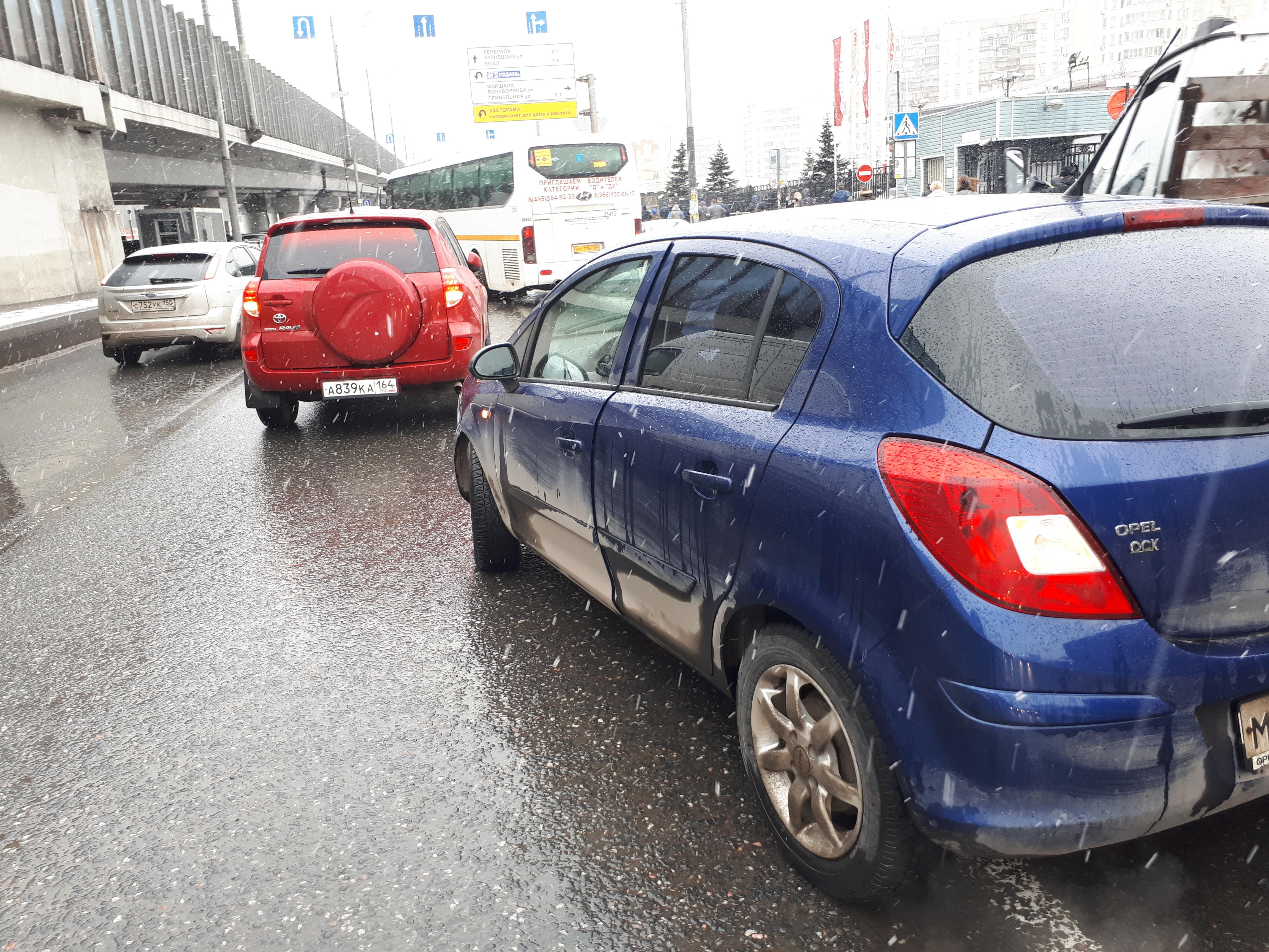 На средней полосе столкнулись две машины Toyota Rav4 (красная) и Opel Corsa (синяя). Ситуация спорная. Прошу откликнуться очевидцев, особенно тех у кого сохранилась запись на видеорегистраторе.