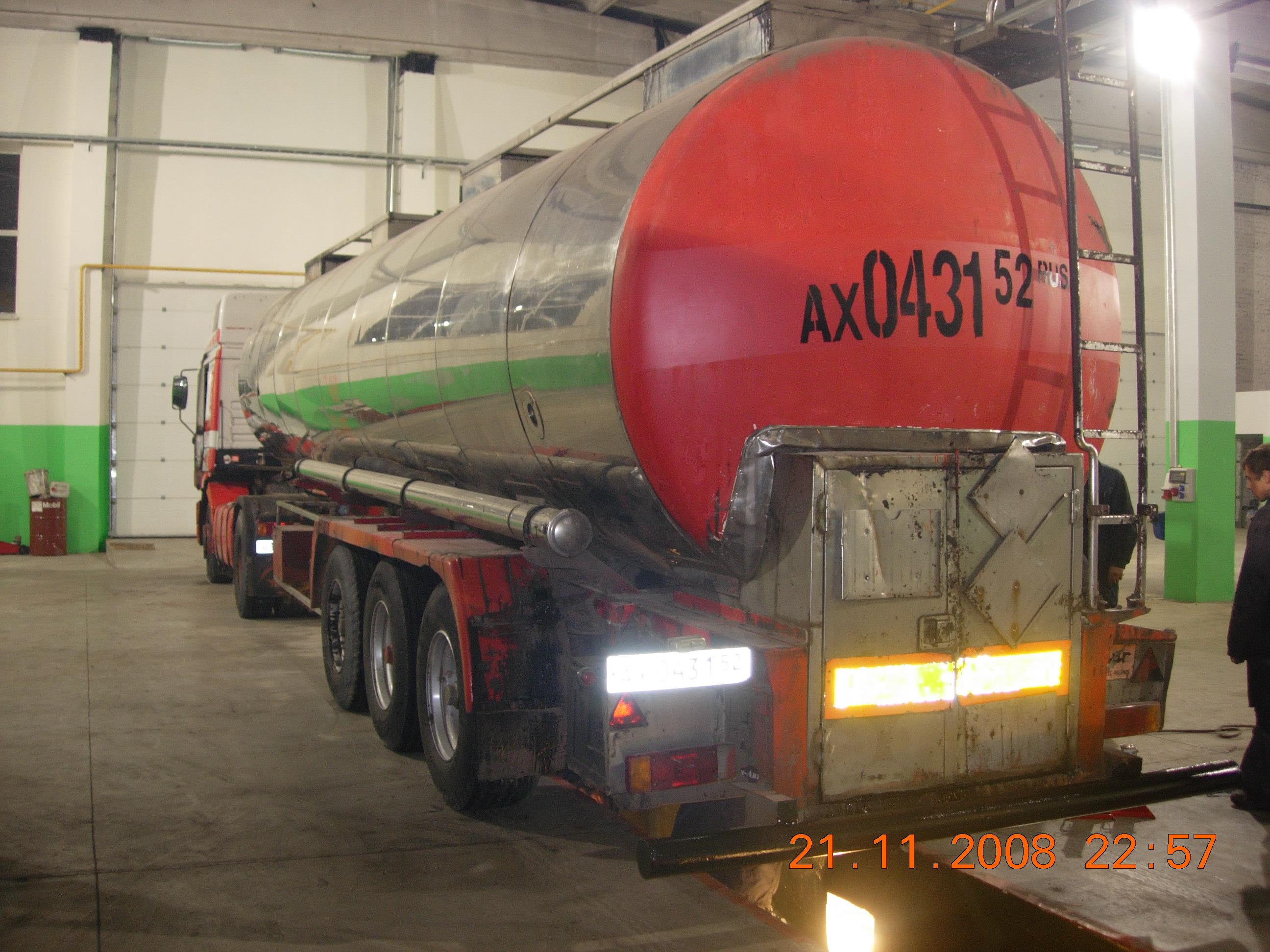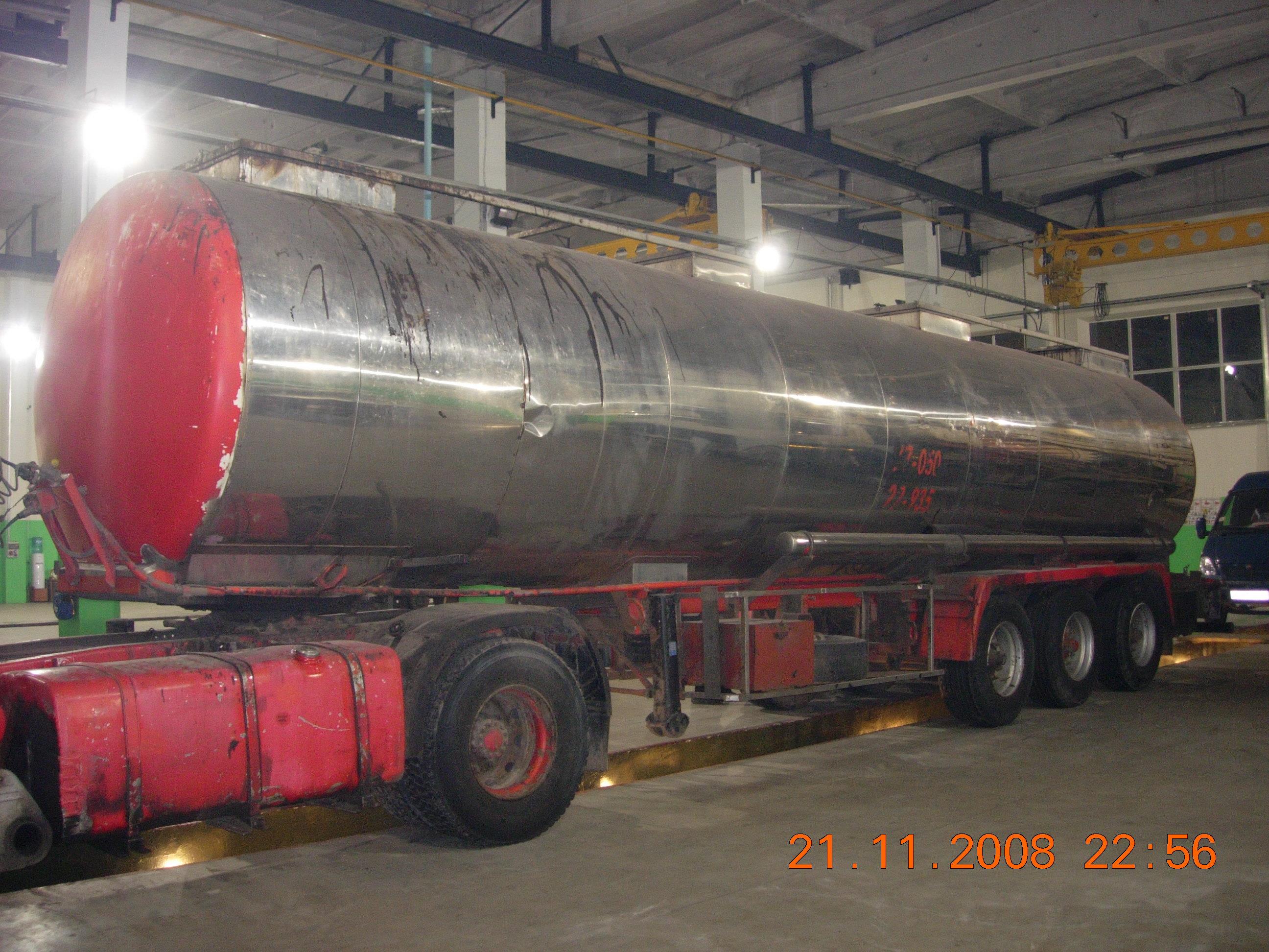 Правая сторона цистерны мятая, передний и задний колпаки крашеные в красный цвет, видны по бокам следы от рекламы красной пленко