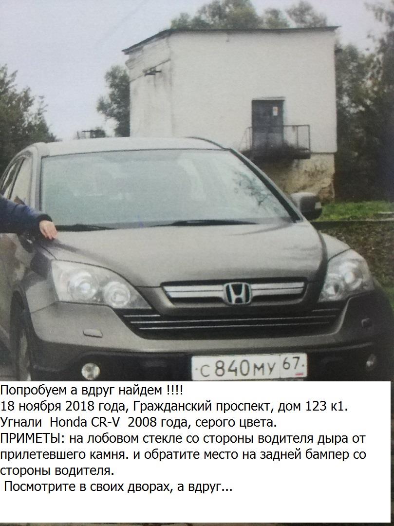 Попробуем а вдруг найдем !!!! 18 ноября 2018 года, Гражданский проспект, дом 123 к2. Угнали Honda CR-V 2008 года, серого цвета. ПРИМЕТЫ: на лобовом стекле со стороны водителя дыра от прилетевшего камня. и обратите место на задней бампер со стороны водителя. Посмотрите в своих дворах, а вдруг...