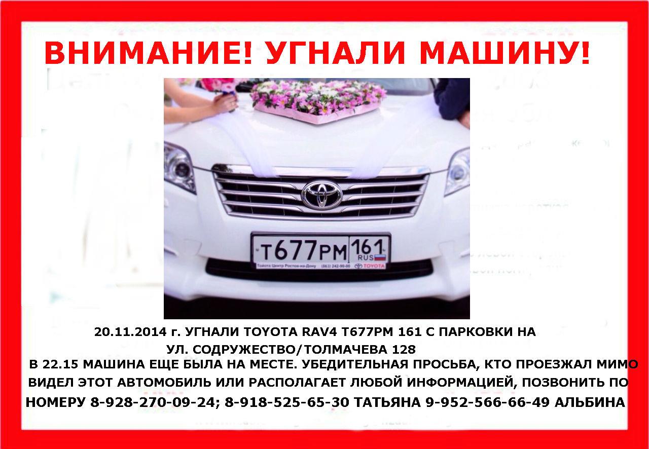 Угнан автомобиль с охраняемой парковки Толмачева /Содружество д.128 Toyta RAV4, 2012 белый цвет, время: в ночь с 20/11/14 с 22-20 по 3-00 21/11/14 . Просьба откликнуться свидетелей, имеющих запись любую информацию м.+7-928-27-00-924