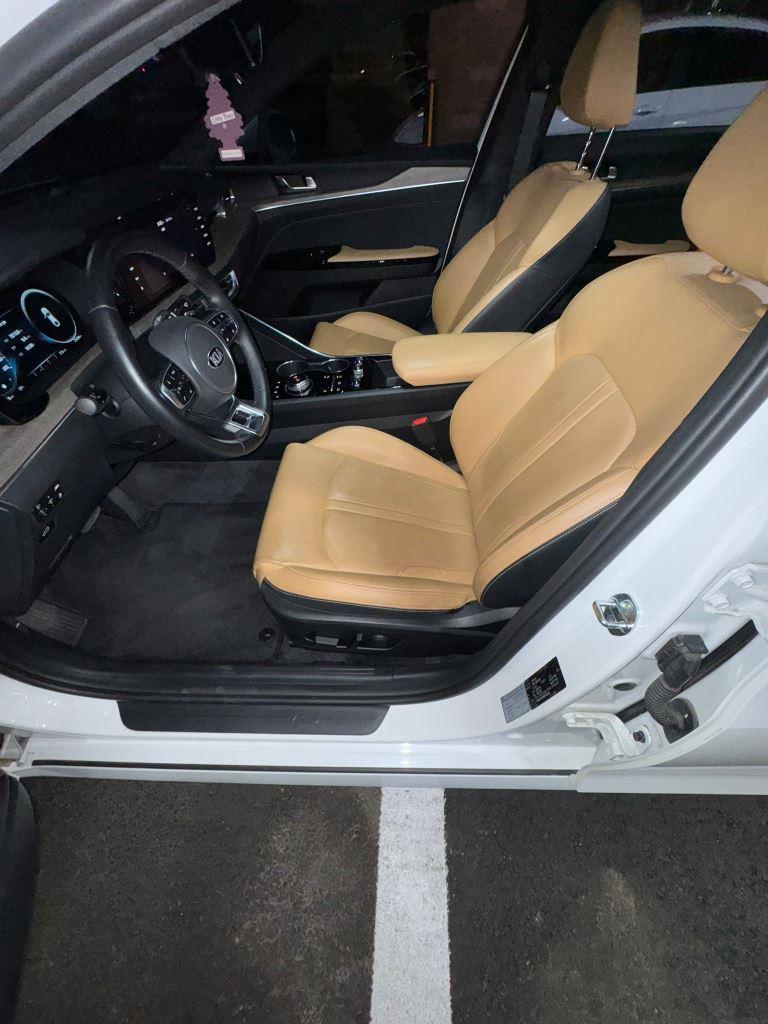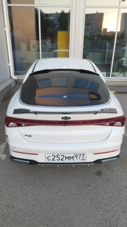 Рыжий салон и детское кресло справа сзади, игрушка пингвин на заднем сидении, спереди и сзади установлен видеорегистратор, чёрный тканевый потолок, рыжие сидения из кожи, шайба вместо селектора КПП, большой спойлер на крышке багажника, а так же на заднем стекле(на фото), на заднем стекле "впаян" шильдик тонировки SUN GUARD U.S., чёрный металлический шильдик К5 на крышке багажника